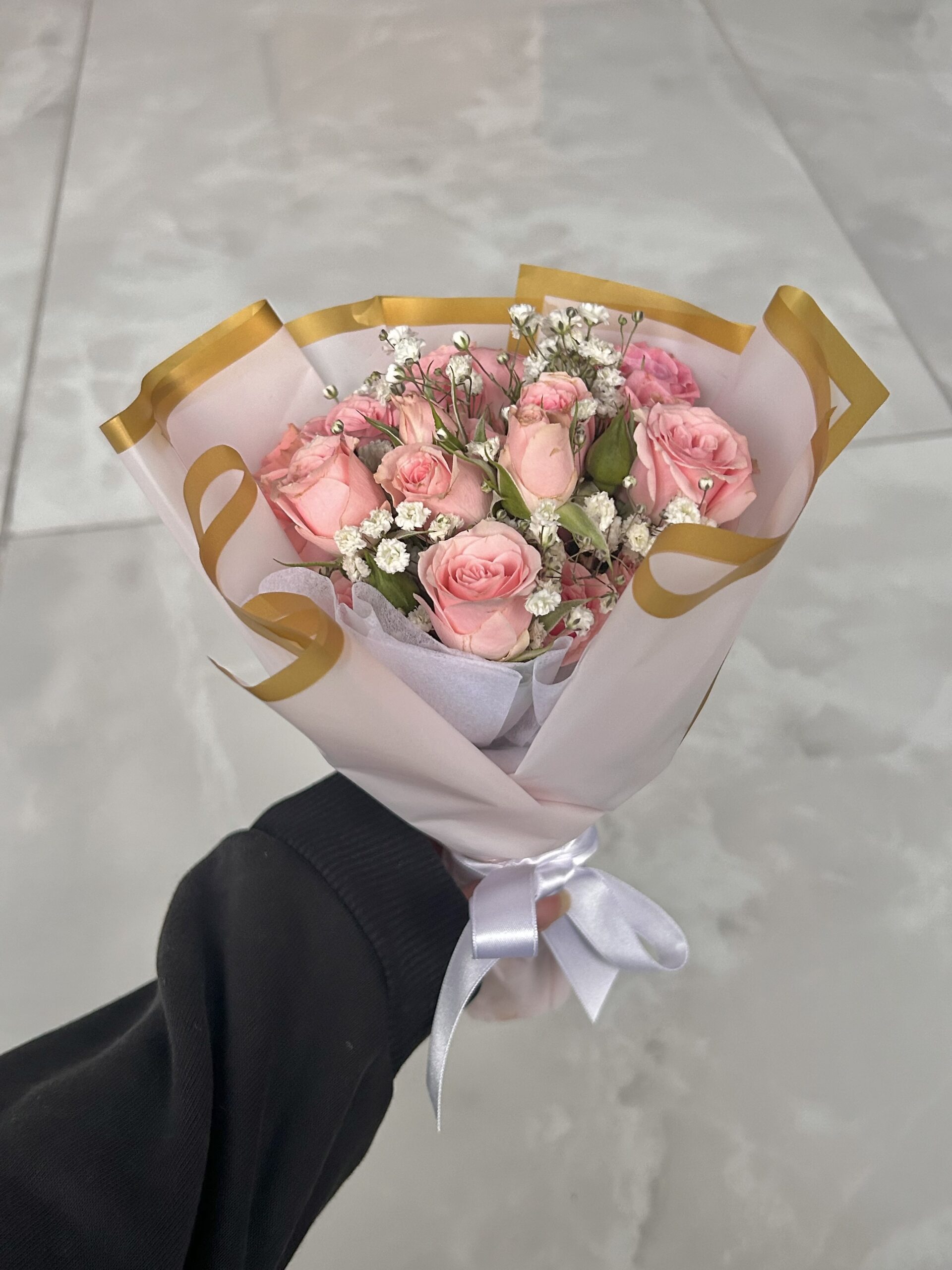 A pink themed mini spray rose bouquet. Made with 3-5 white and pink spray roses and baby breath. Wrapped in pink waterproof paper.