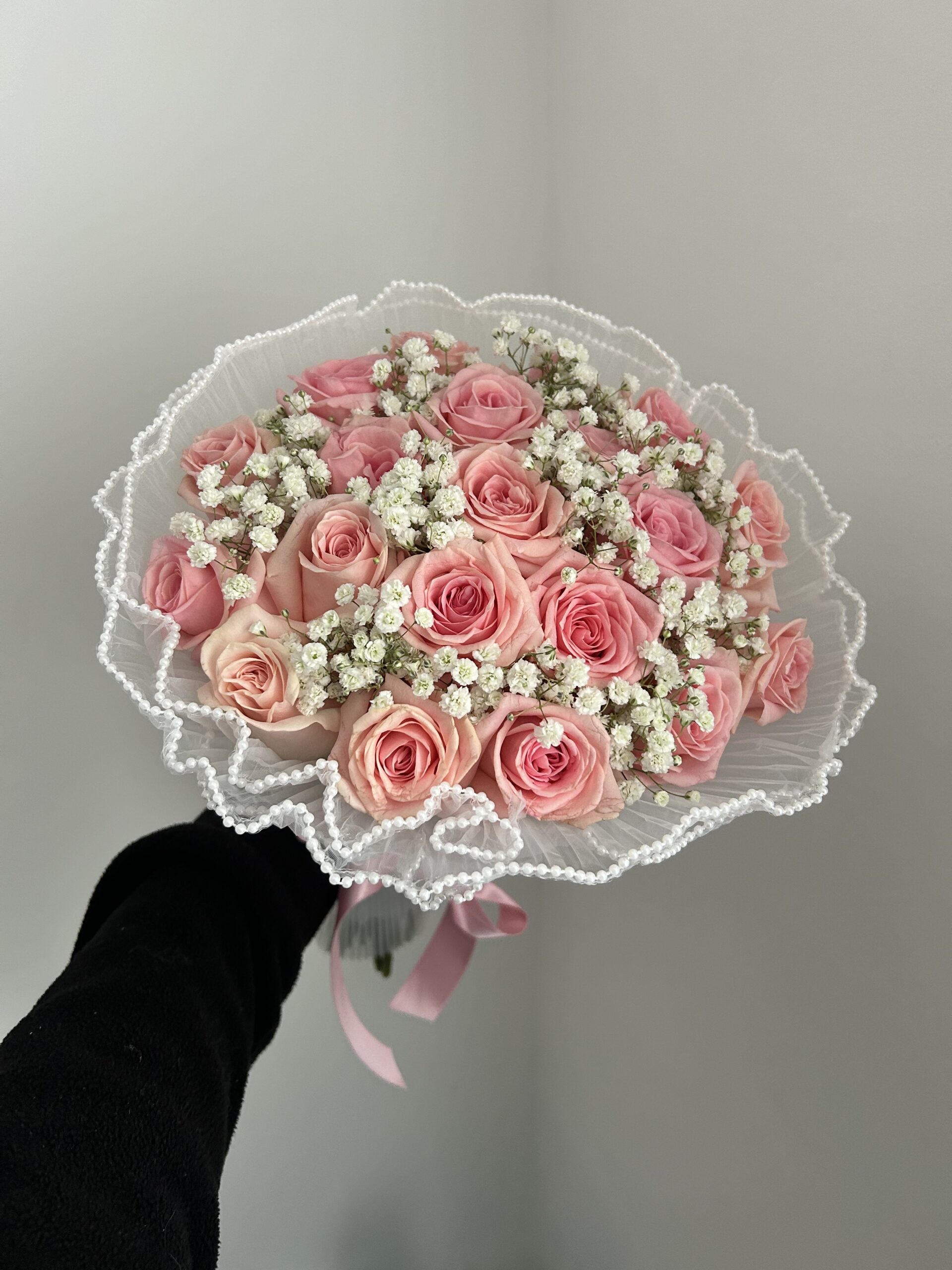 Perfect for the pink flower loves. 20 stems of baby pink roses mixed with gypsophila. Wrapped in white pearl net.