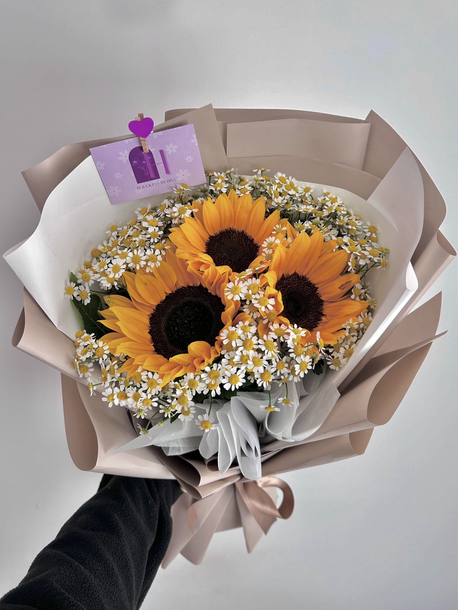 A bright bouquet perfect to lighten up someone’s day. Made with sunflowers and daisies. Wrapped in white and beige waterproof paper.