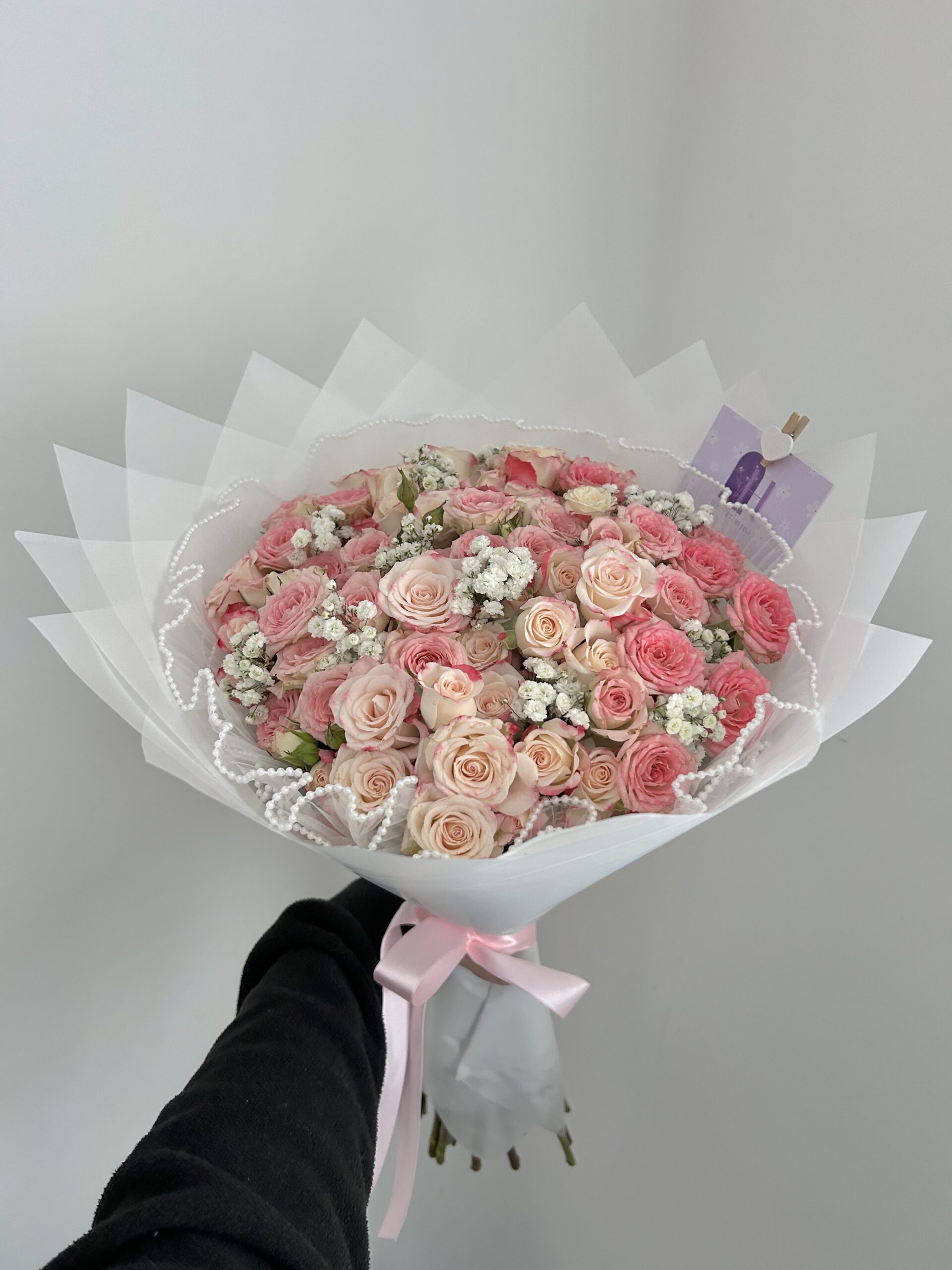 A sweet way to make your loved one blush. Made with spray roses. Wrapped in white floral waterproof paper.
