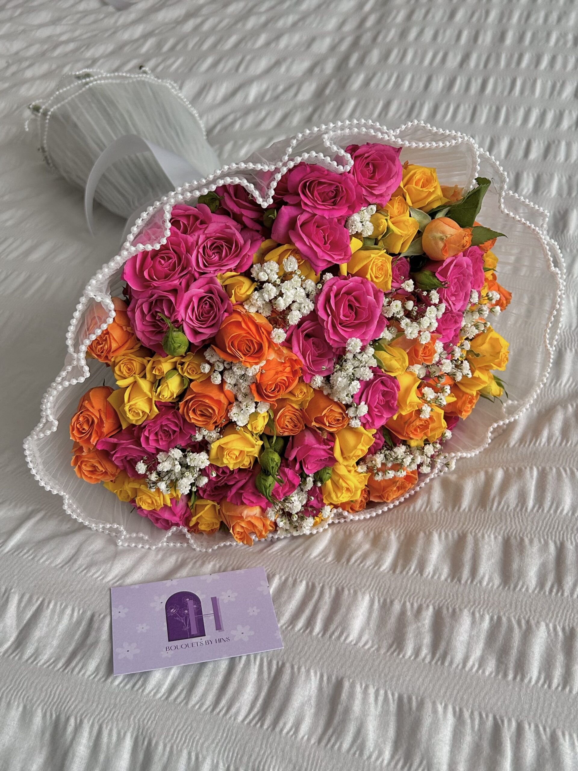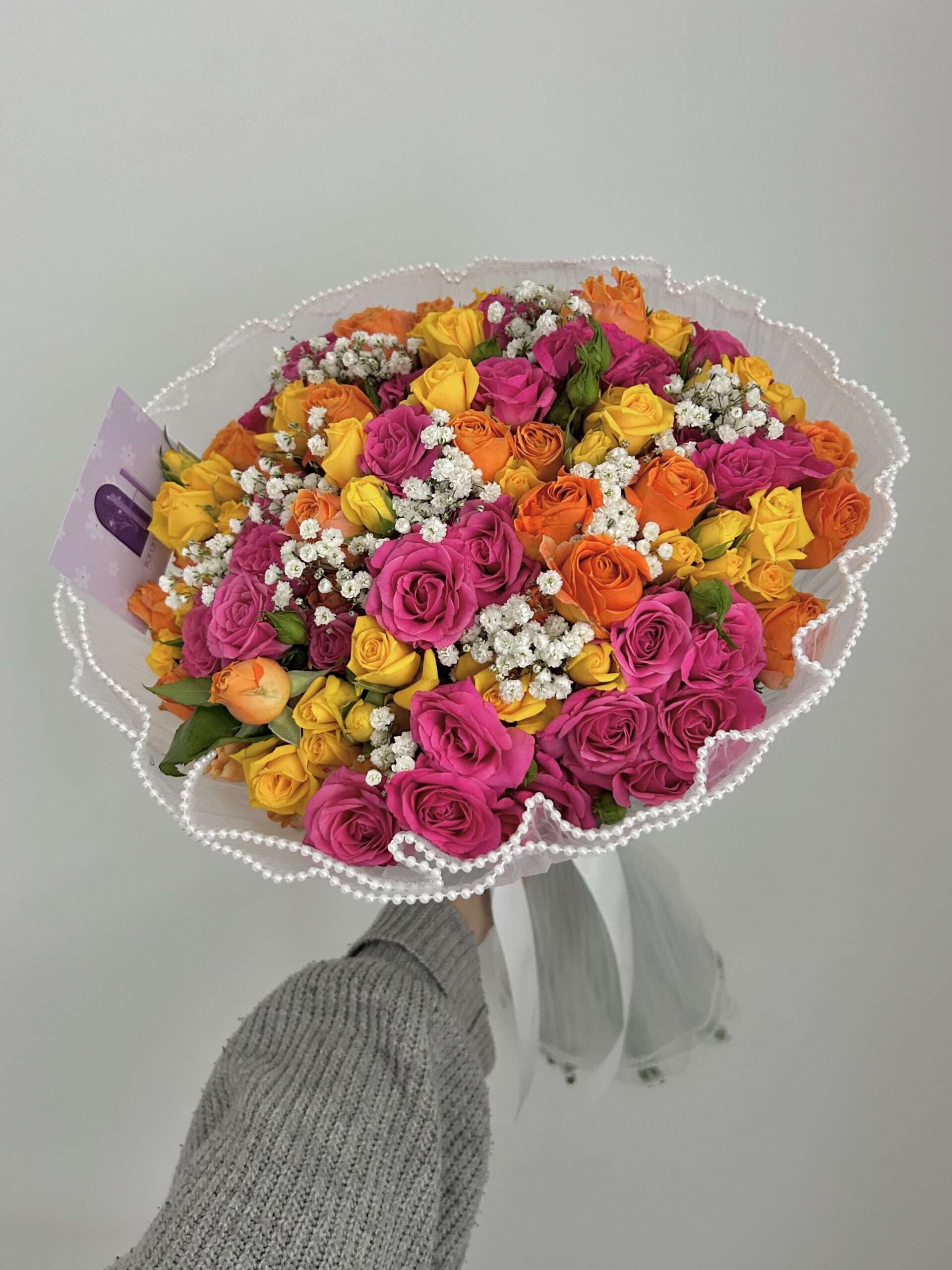A vibrant mix perfect for any occasion. Made with spray roses. Wrapped in white pearl net.